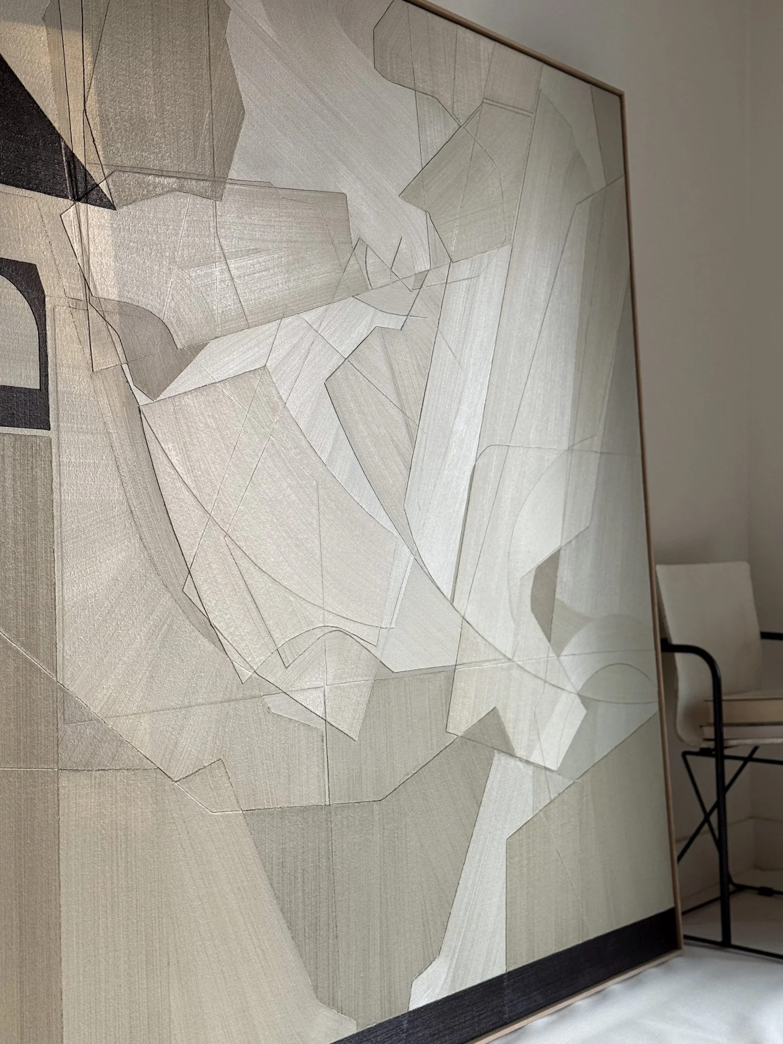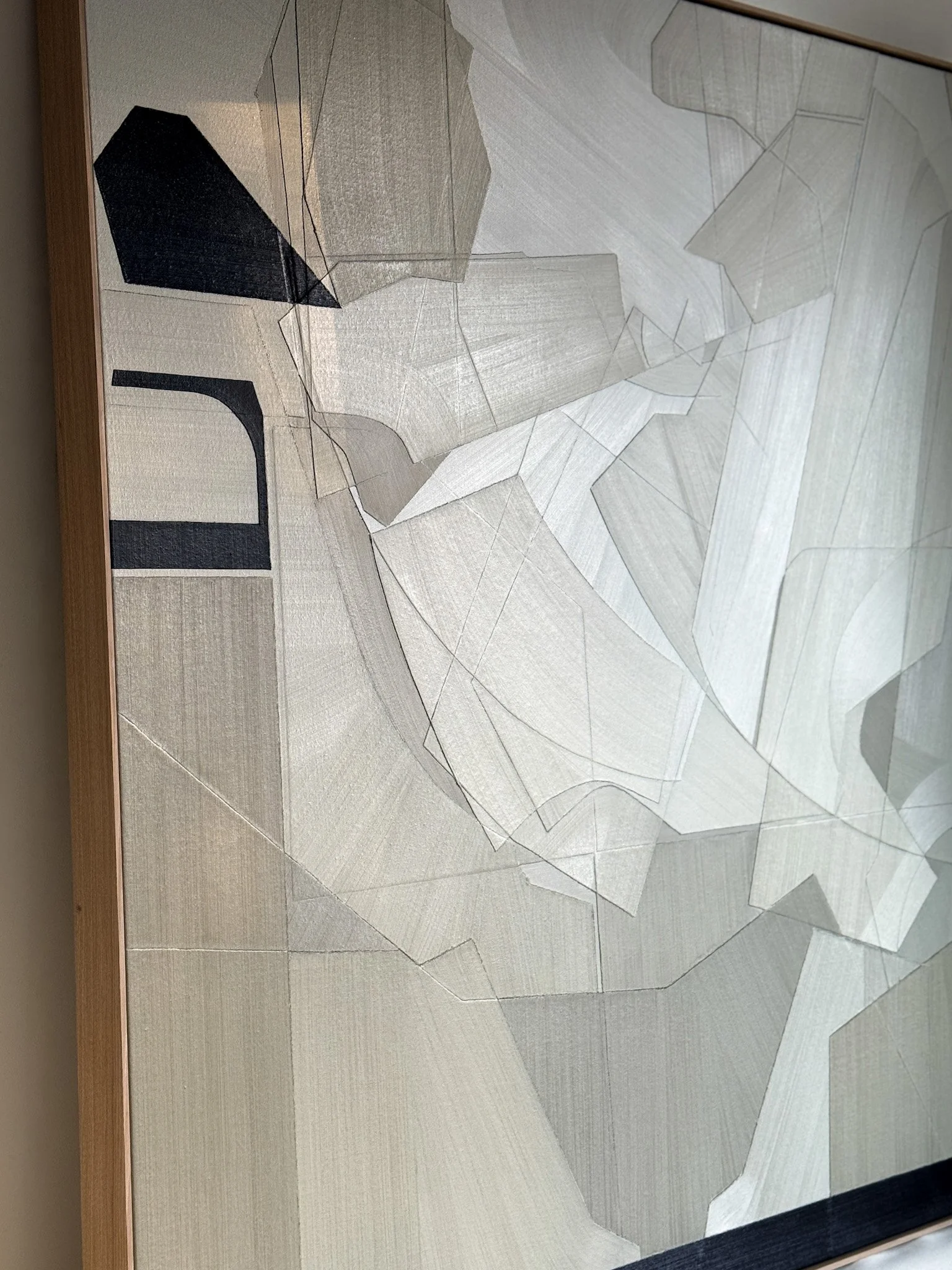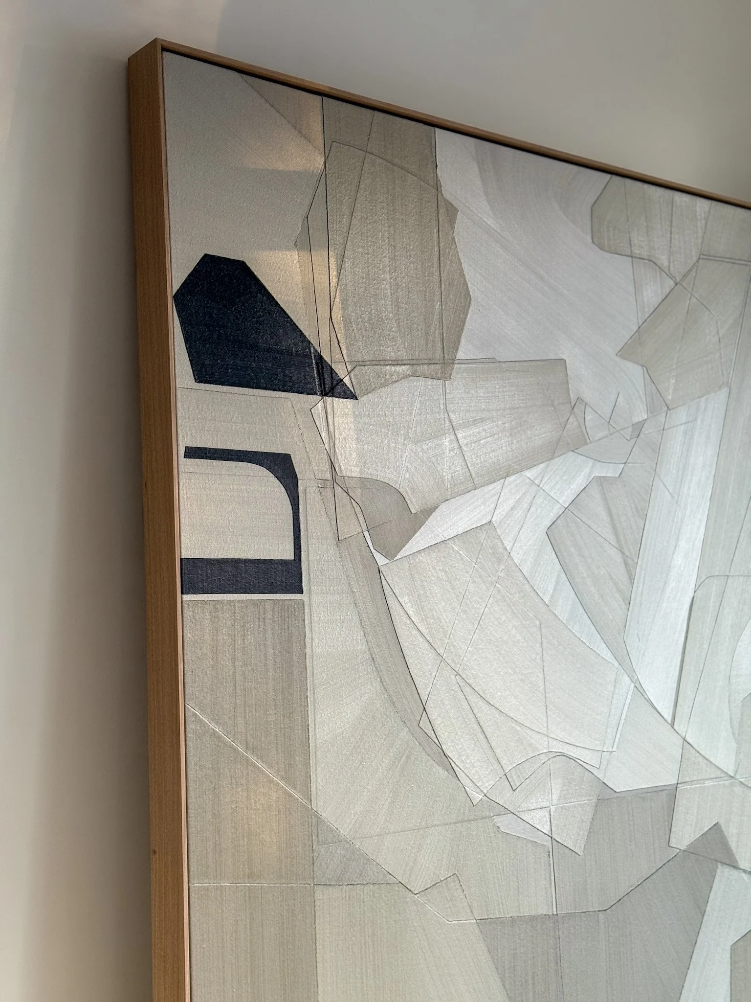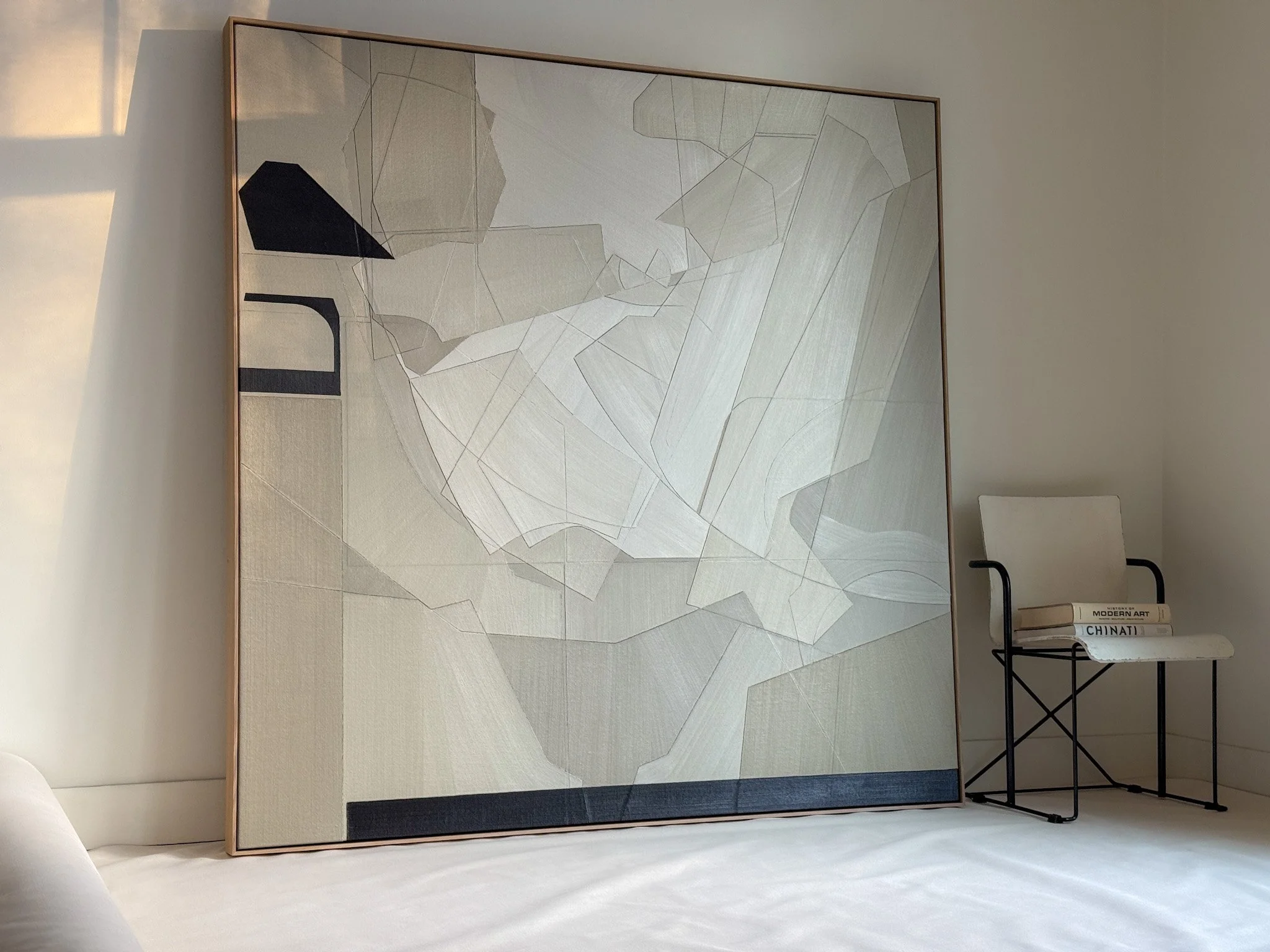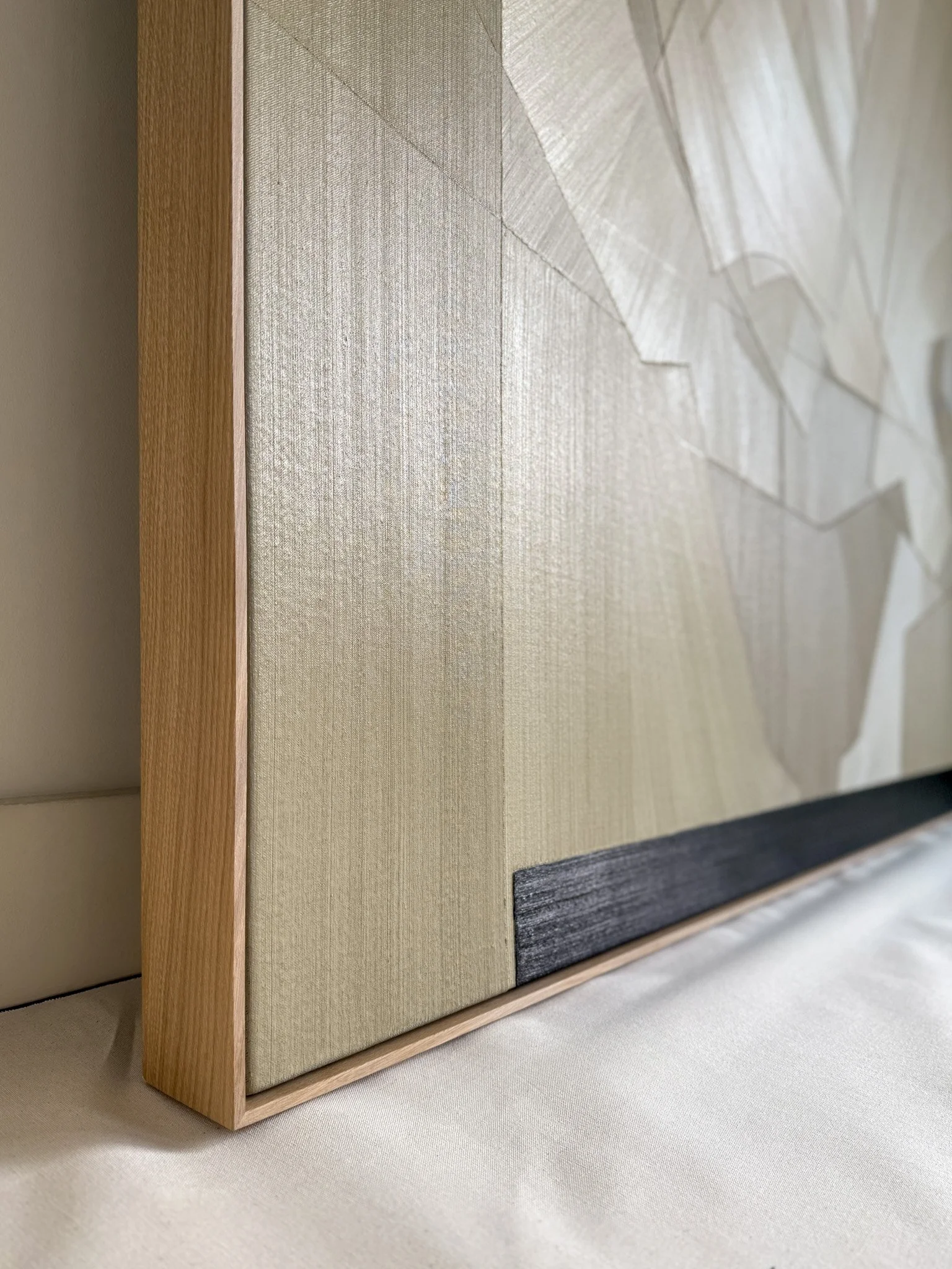 72’’ x 72’’ abstract duck cloth collage oil painting framed in rift sawn white oak