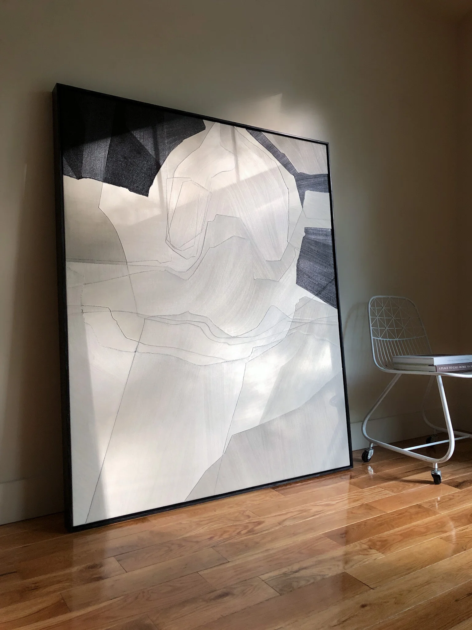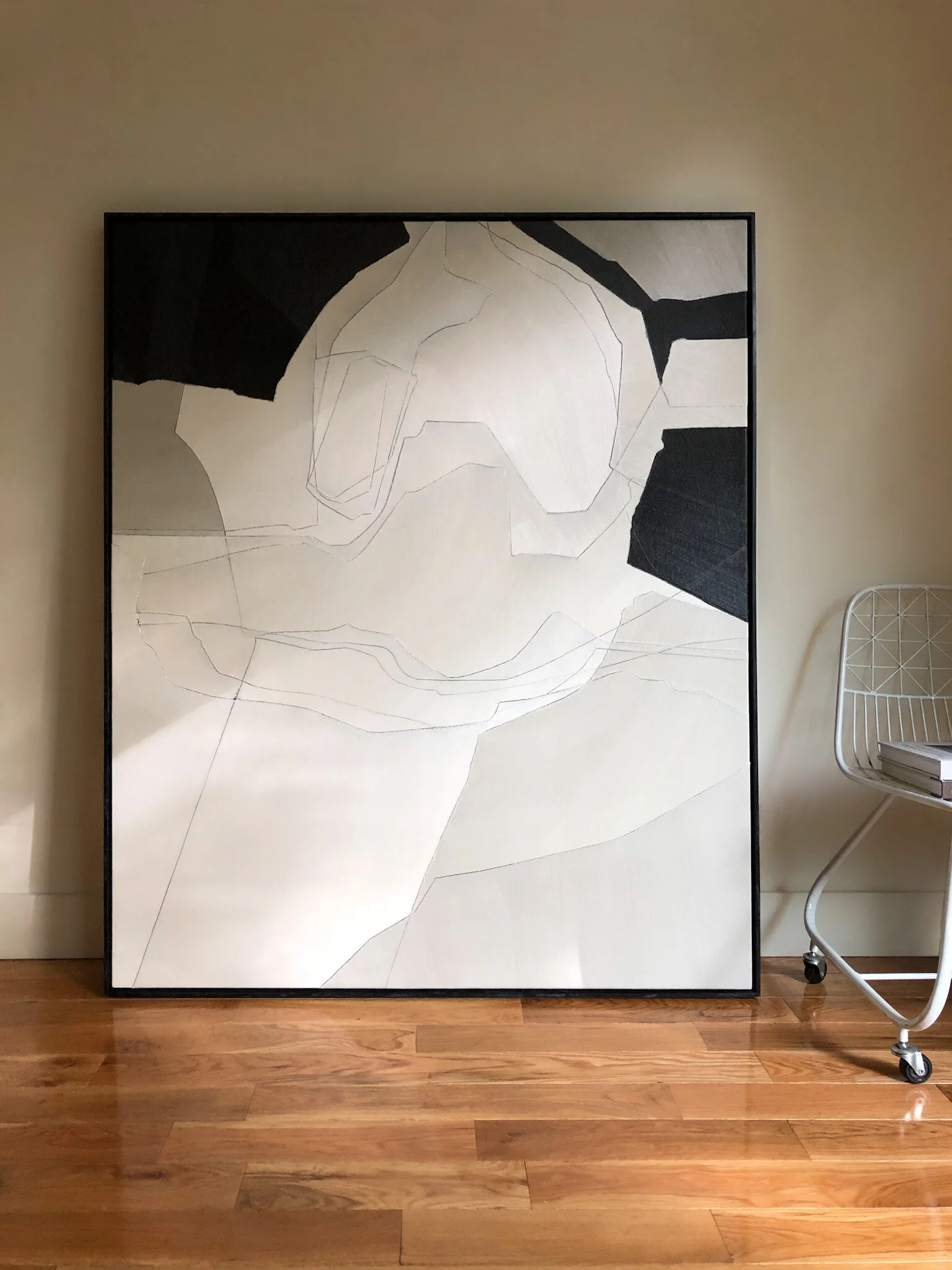 50’’ x 60’’ abstract duck cloth collage oil painting with a black cerused white oak frame